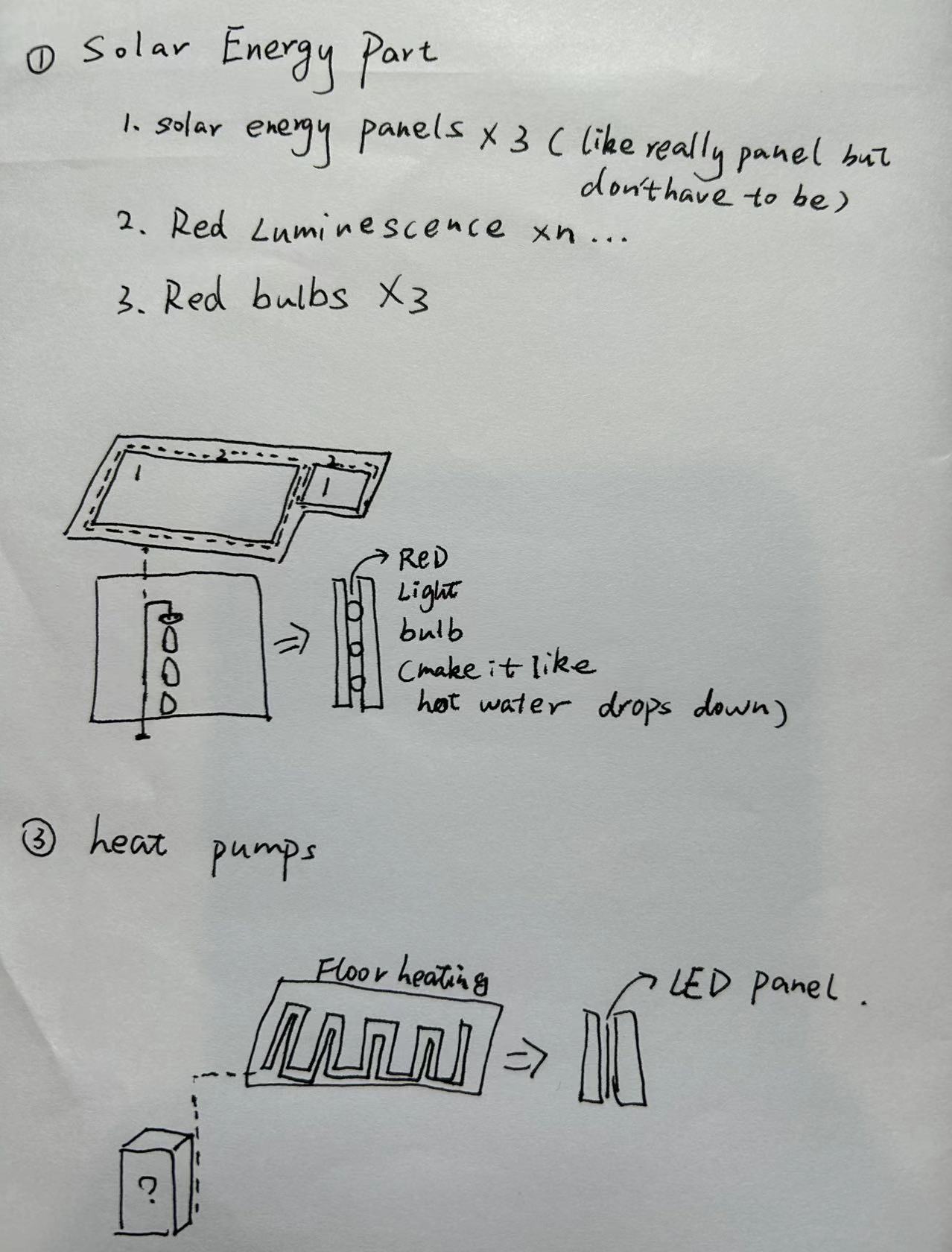 The complete system includes three parts. The first part is the graphic interface part, which will be achieved and made by Processing. The second part is the hardware part (a model), which will be achieved by Arduino and 3D printing (possibility). The last part is the projector part, which will be used to show the changes the house can make if it is a zero-energy house. The interface will be designed to control and interact with the zero-energy building model. For instance, if the user chooses to add solar energy in the house, there will be corresponding reactions on the house model. Besides, the projector will project more green trees if users use more clean energy on the house model.