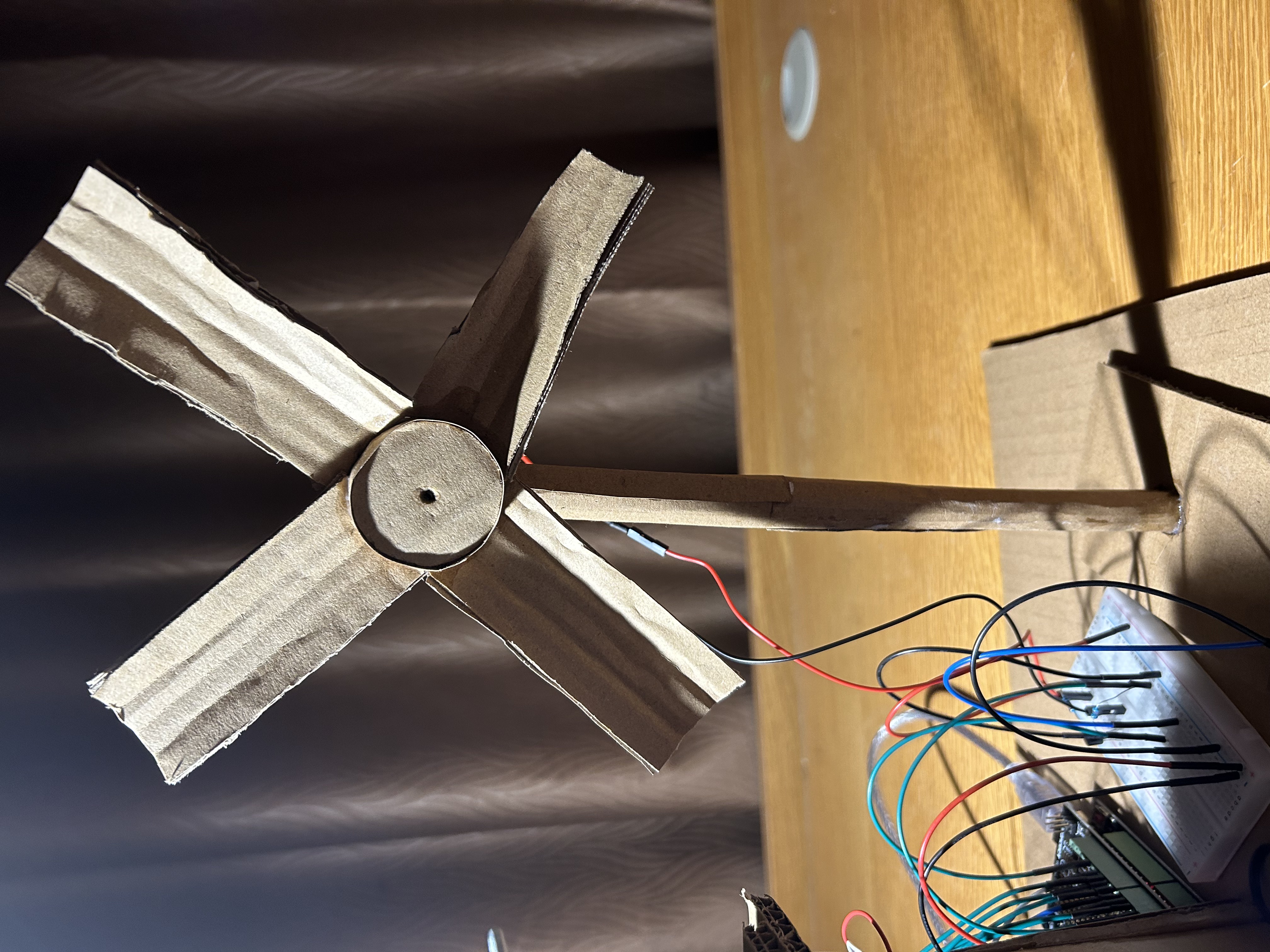 The wind turbine part consists of four main components: a DC motor, a wind turbine model, 4 light bulbs, and Resistors. This is a simulation of the wind energy process. Wind energy is typically providing the house with electricity. So the light bulbs here are representing the electrical facilities in a house.