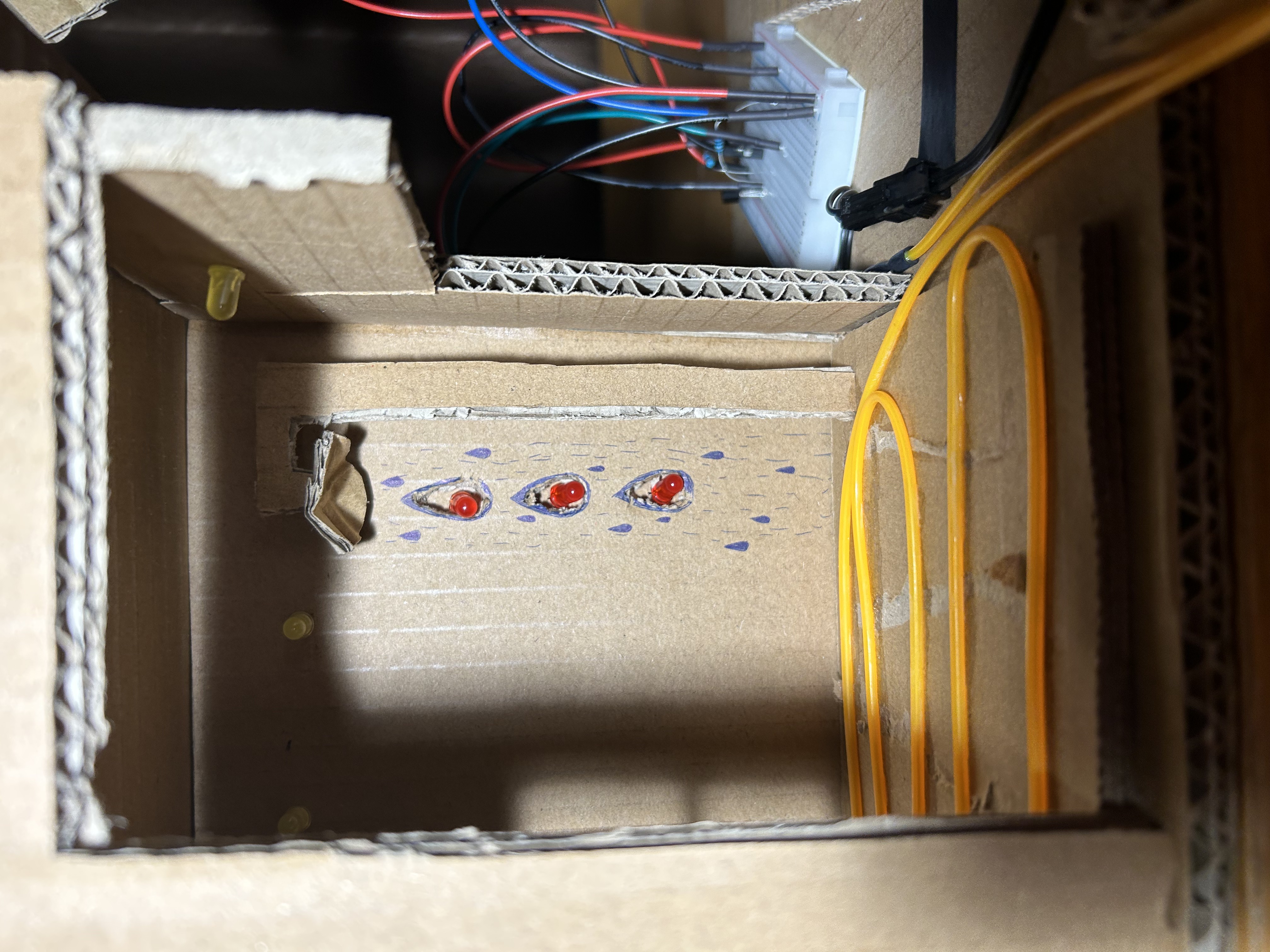 The solar panel will move based on the position of the lights. There are two Ambient Light Sensors. Arduino will compare the numbers that each Ambient Light Sensor transfers and make the motor move based on the numbers. Also, the red light bulbs will light up, representing the hot water coming down because of the solar energy.